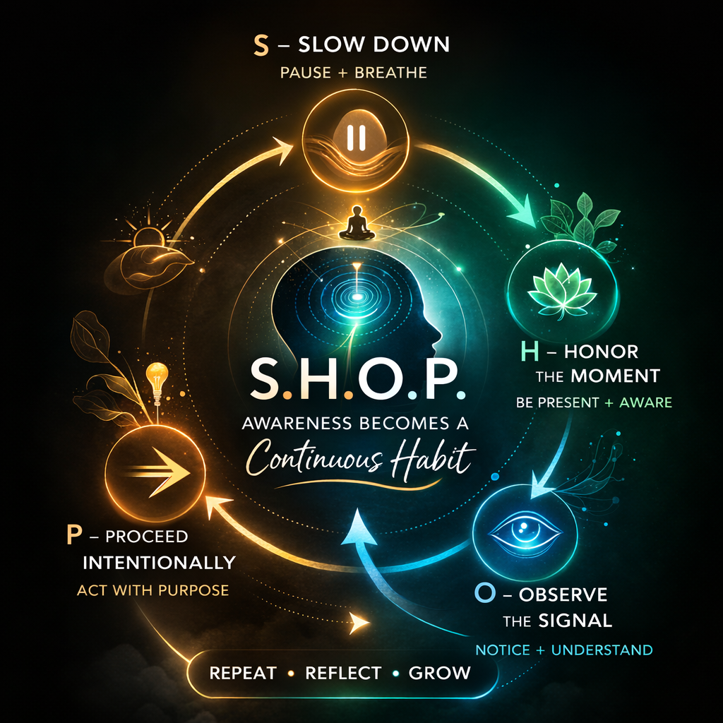 ~The Power of the Now: Awareness thrives in the present moment. By anchoring attention to the here and now, we transcend regrets of the past and anxieties about the future, finding clarity and peace.